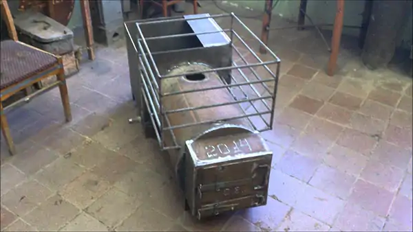 Для изготовления прибора берётся отрез трубы размером 0,8 м, зашлифовываются проёмы. Снизу устанавливается колосник. Для него годится металлический лист, достаточный для того, чтобы выкроить прямоугольник нужного размера. В материале вырезают середину, края при этом оставляют не слишком узкими. Затем приваривают прутья из металла. Готовый колосник монтируют к корпусу.
