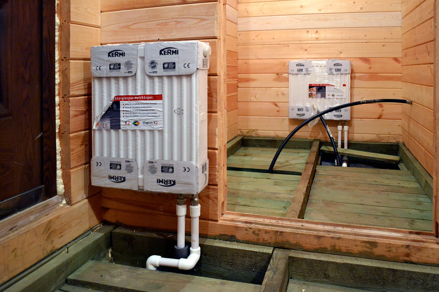 - Радиаторный обогрев. Для этого вдоль стен прокладывают трубы, к которым подсоединяют работающие на воде радиаторы либо конвекторы, подбираемые по мощности и типоразмерам. Тепловой носитель передвигается от котла по системе и обеспечивает отопление.