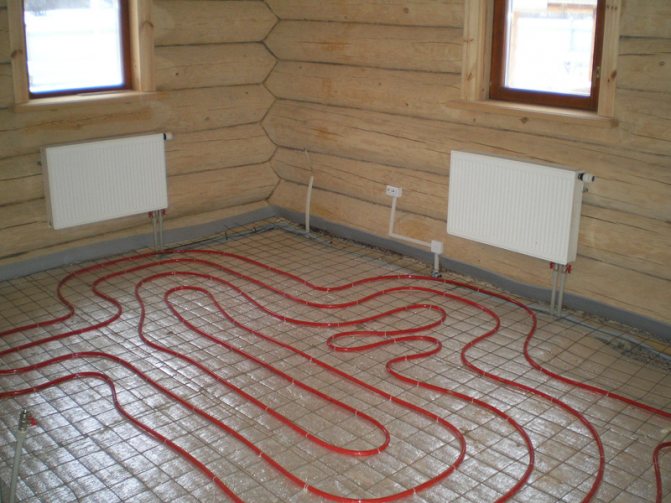 - Напольный обогрев. Работает по аналогичному принципу. Однако в этом случае трубы устанавливают в основание из бетона, которое перед этим утепляют и подвергают гидроизоляции. Такая конструкция является неразборной.