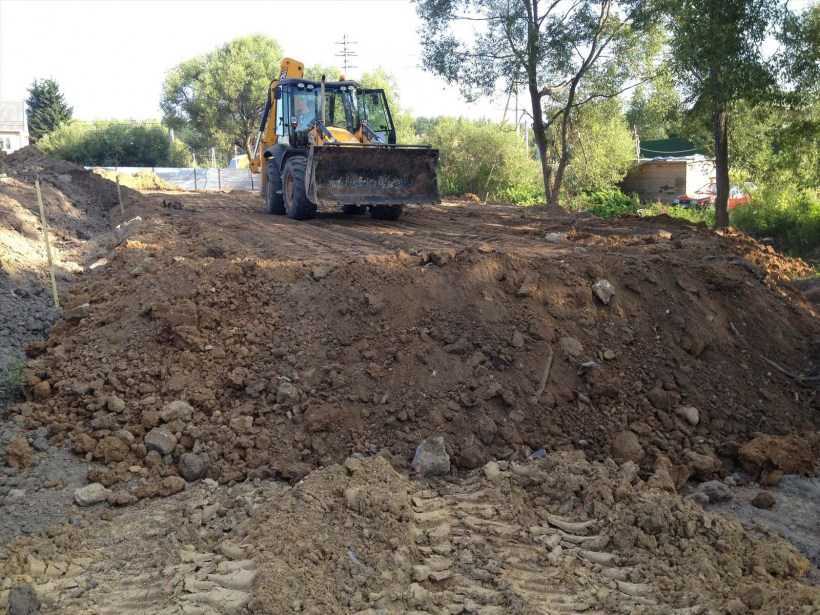 После оголения плотного пласта проводится серия геодезических замеров. Зная конфигурацию верхнего водоупора, можно определить необходимый объём грунта и начать его завоз. Параллельно вычисляют объёмы щебня для подсыпки и планируют устройство дренажной системы.