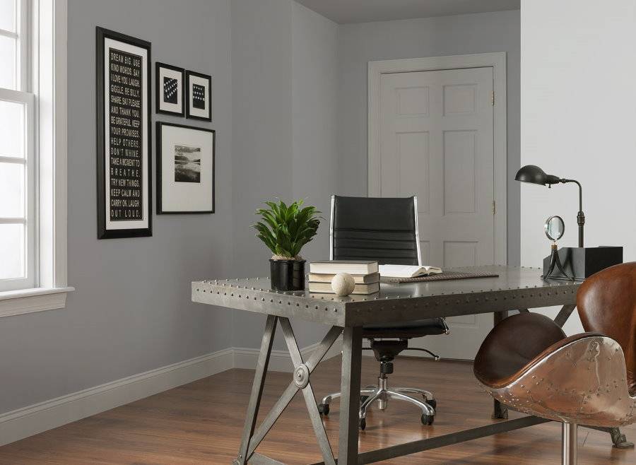 Дизайн кабинета должен настраивать на работу. Выполненный в серой гамме он придает комнате строгости и сдержанности. В добавление к серому можно использовать коричневый или же черный. Акценты синего будут возвращать ощущение прилива сил и снимать усталость. Зеленый поможет настроиться на «рабочий лад».
