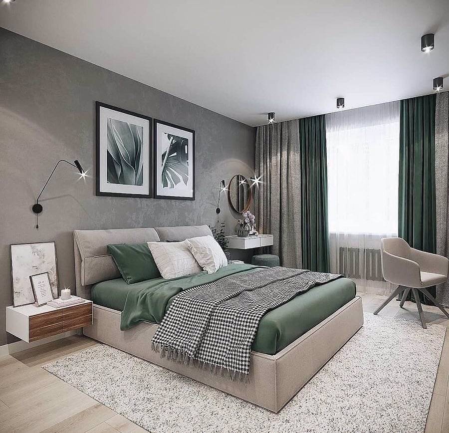Серо-зеленая комбинация приятна для глаз, успокаивает нервы и способствует полноценному отдыху