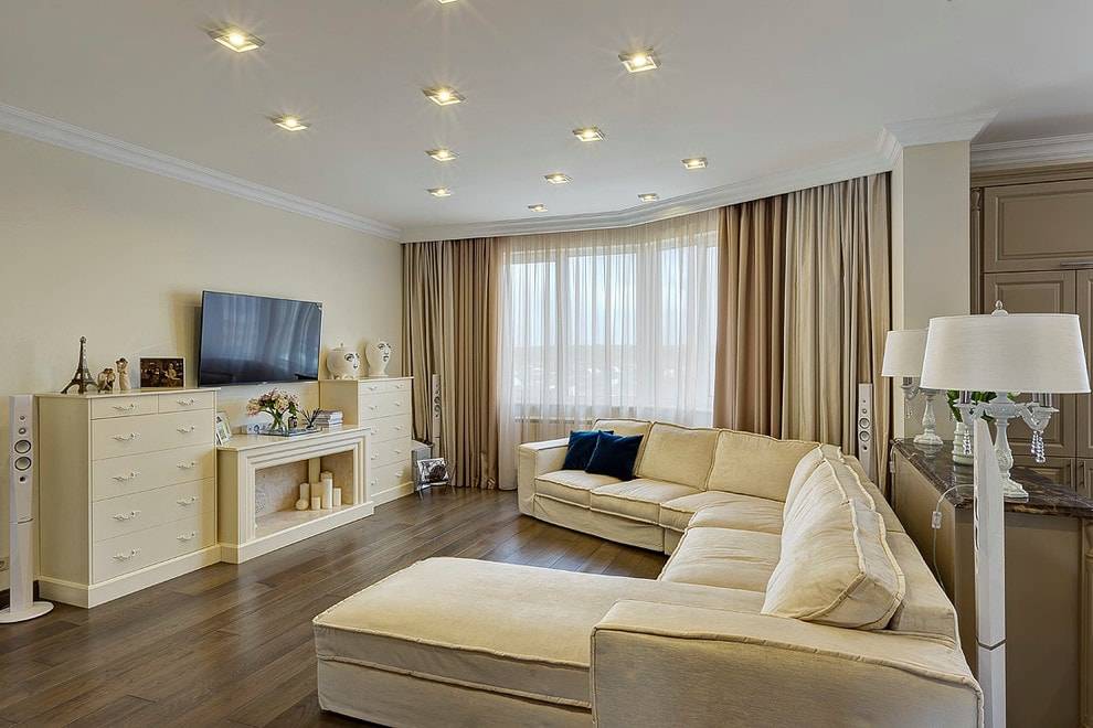 Для небольшой гостиной важно выбрать светлый оттенок отделки и текстиля, а также глянцевый пол. Из декора стоит отдать предпочтение картинам с рамами, зеркалам, вазам, классическим портьерам из парчи или бархата с подвязками и драпировкой