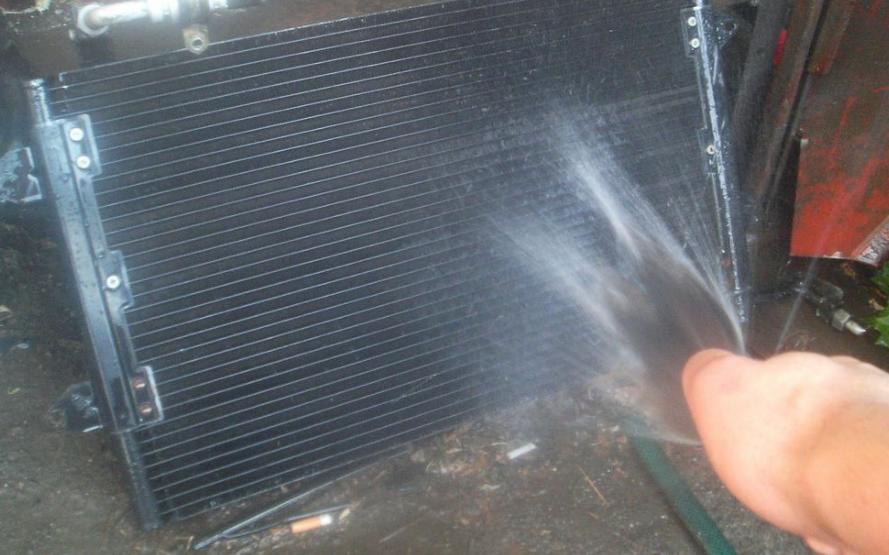 - Получив доступ к радиатору кондиционера, надо вначале промыть его несильной струей воды изнутри, а затем снаружи. Очистка таким способом производится несколько раз, попеременно — изнутри и снаружи.