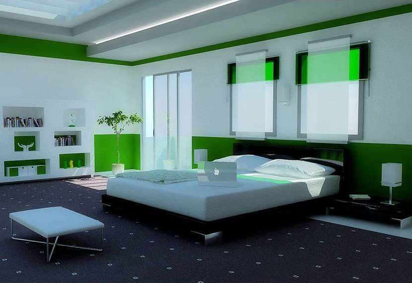 В большой комнате органично смотрятся несколько оттенков из одной палитры. Вариации зеленого позволят использовать в помещении тона разной интенсивности. Акцентную стену у изголовья кровати делают из самого насыщенного цвета, остальные поверхности постепенно осветляют. Роскошно выглядит чередование широких полос разной расцветки.