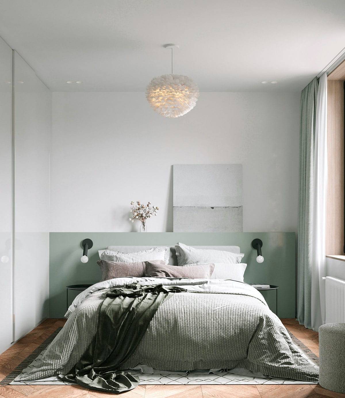 Одна из основных деталей в интерьере спальни 2021 — оригинальная лампа на потолке. Светильник может быть тонким и нежным, его стоит подвесить немного выше, в районе изголовья кровати либо в середине потолка. Лучший свет в комнате для отдыха – мягкий, он не должен быть навязчивым. Хорошим выбором будут светильники из соломки, с простыми плафонами из грубоватой ткани, из матового стекла.