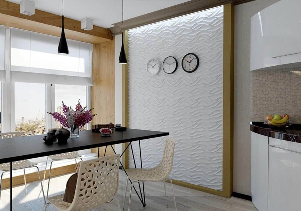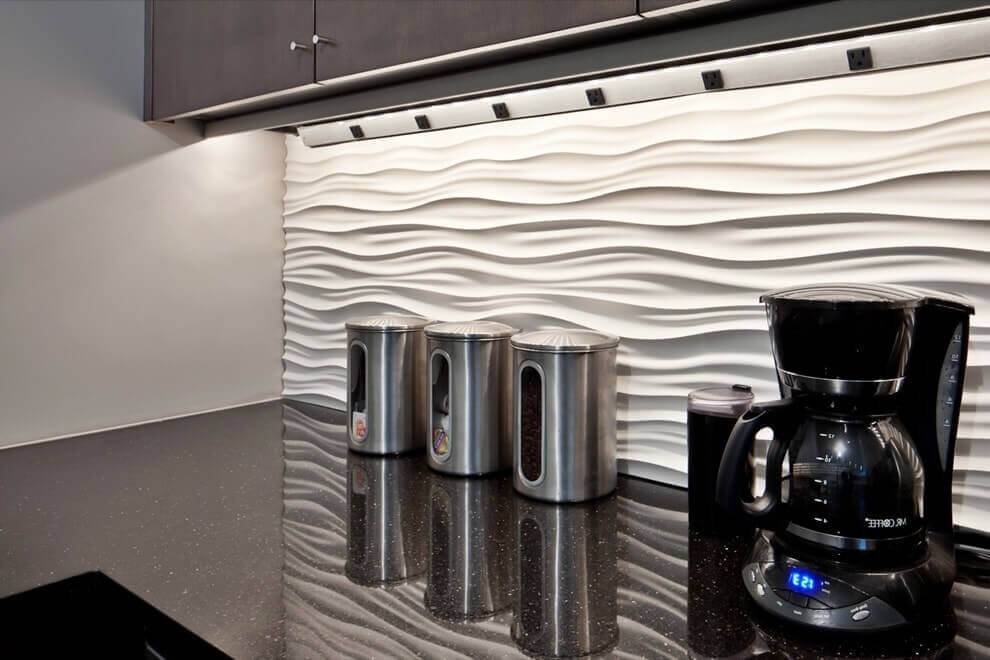 Если выбирать из 3Д-панелей, то на эту роль подходят изделия из МДФ, стекла или алюминия. Единственный минус, с которым можно столкнуться при установке трехмерных панелей на кухню – их сильное загрязнение. Особенно это касается комнат, в которых плохо работает вытяжка. На рельефе конструкции может скапливаться не только пыль, но и жир, избавиться от которого довольно сложно. Конечно, всё это можно устранить, используя качественную продукцию для облицовки стен. Современные производители позаботились о том, чтобы их изделия могли устанавливаться в том числе и на кухне. Они снабдили их специальной защитной поверхностью, которая не только отталкивает пар и жир, но и довольно проста в уходе.