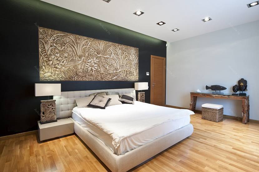 В спальной комнате с помощью панно можно выделить стену над кроватью. Для этого подойдет рельефная композиция из гипса. Она может не иметь смысловой нагрузки, а просто украшать стену простым узором.