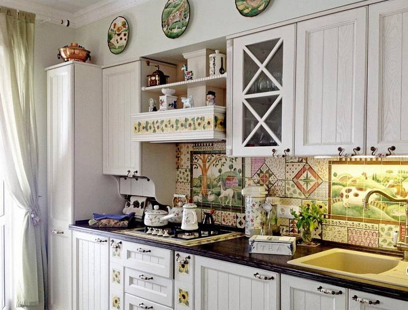Кухонный фартук белой кухни в деревенском стиле дополнит панно с изображением природы.