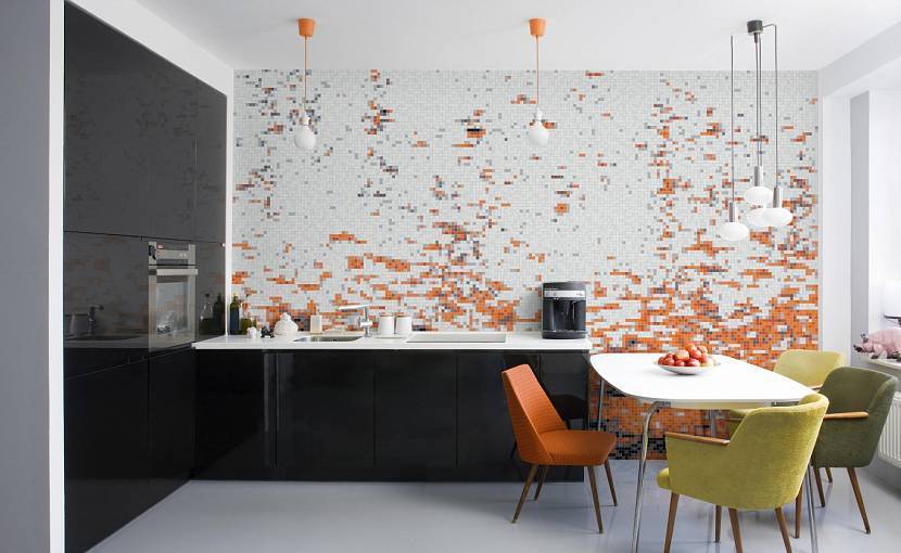 Оформить свободную стену в интерьере современной кухни, выполненной в стиле минимализм, можно мелкой мозаикой в тон основным цветам.