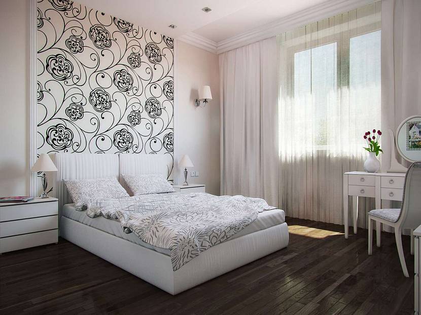 В интерьер белой спальни впишется панно из черно-белых обоев.
