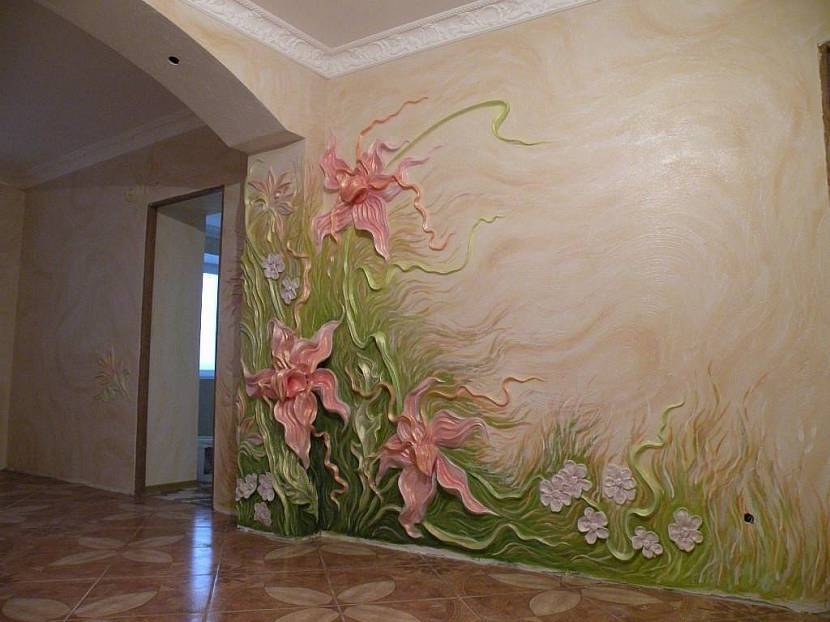 - зонирование. Фреской можно украсить только часть стены, отделяя одну зону от другой. Допустим, стены в совмещенной кухне-гостиной оштукатурены. Одну из стен в гостиной можно украсить фреской. И тогда уж точно никаких стен не понадобится, чтобы провести черту между разными зонами;