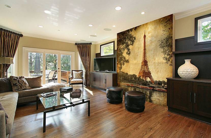 Бывают ситуации, когда любой объект в пространстве над диваном будет казаться лишним. В этом случае при планировке дизайна гостиной заранее выделяется место установки дивана и стену в этом месте оформляют фактурно. Можно сымитировать кирпичную кладку, поработать декоративной штукатуркой, выложить мозаичное панно. Неординарно будут смотреться за диваном фотообои в 3д качестве. Они могут изображать природу, ночные города, исторические и туристические объекты.
