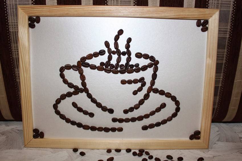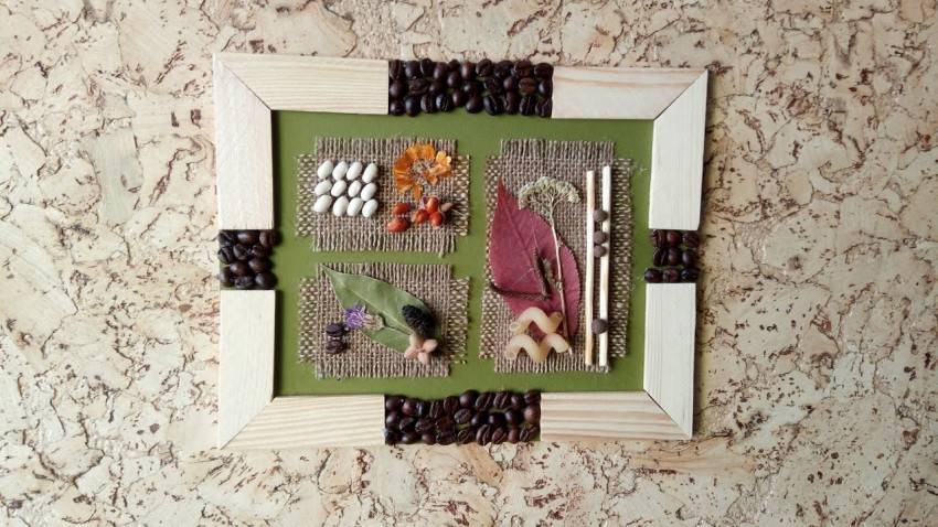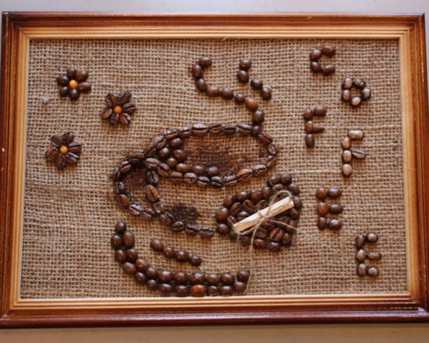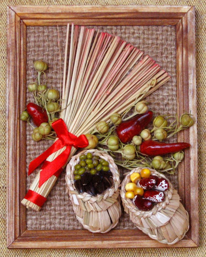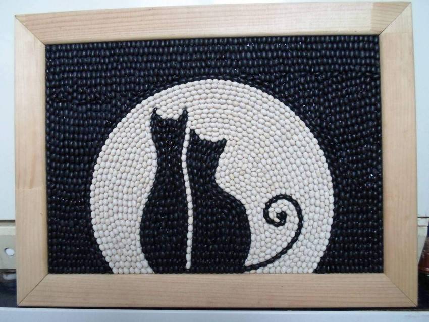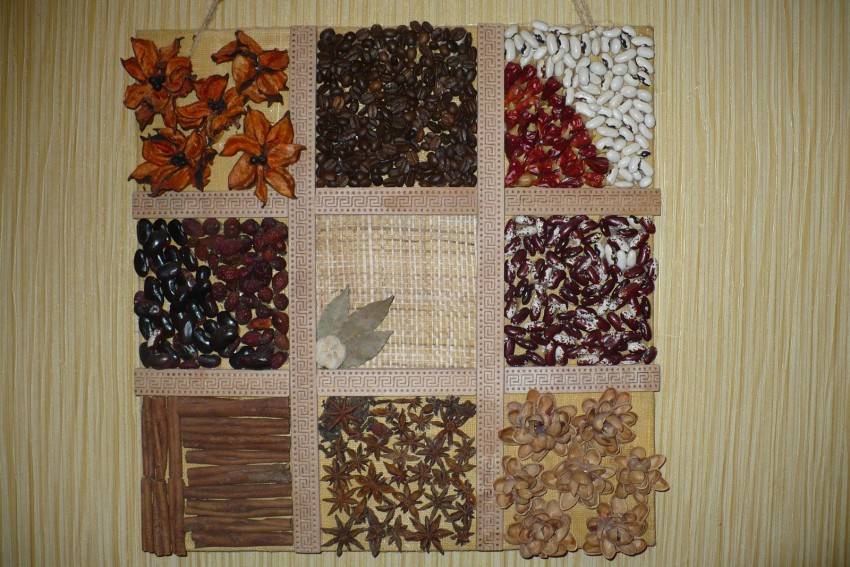 Например, в интерьере кухни хорошо будет выглядеть панно из наклеенных на натянутый холст или на картон зерен фасоли разной окраски. Фасоли, конечно, потребуется немало. Зерна можно выложить в виде орнамента либо простейшей композиции. Такое панно лучше вставить в застекленную деревянную рамку.