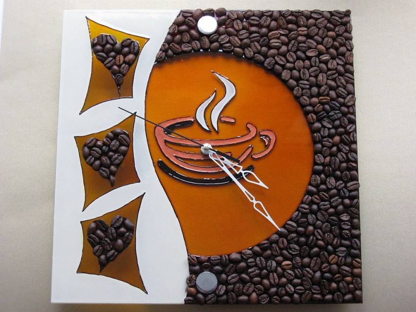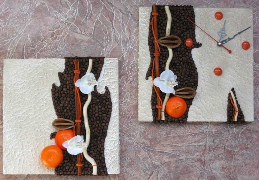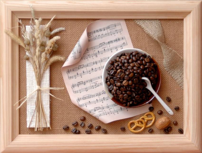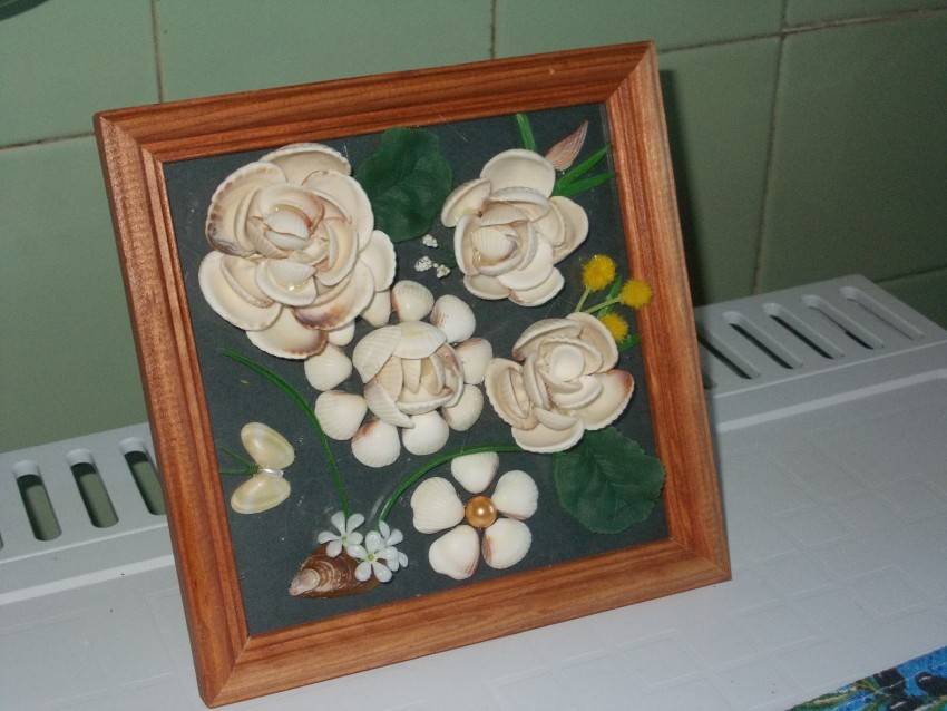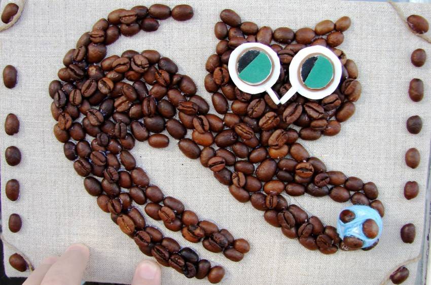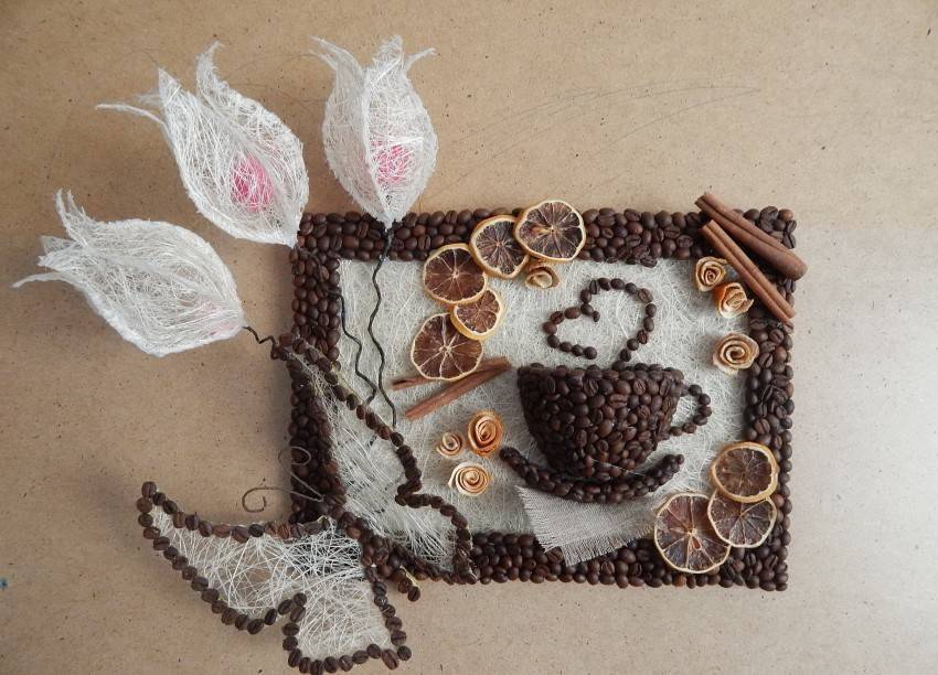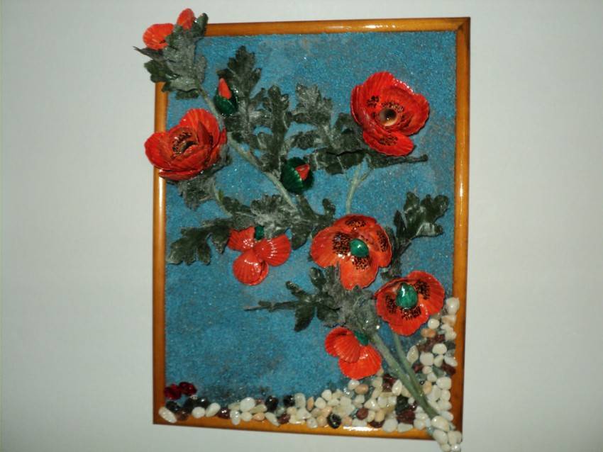 Например, в интерьере кухни хорошо будет выглядеть панно из наклеенных на натянутый холст или на картон зерен фасоли разной окраски. Фасоли, конечно, потребуется немало. Зерна можно выложить в виде орнамента либо простейшей композиции. Такое панно лучше вставить в застекленную деревянную рамку.