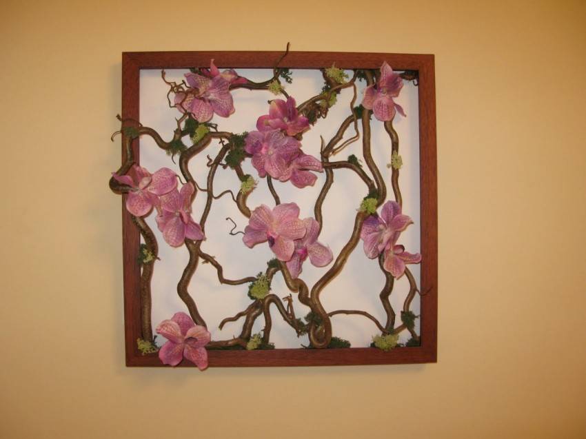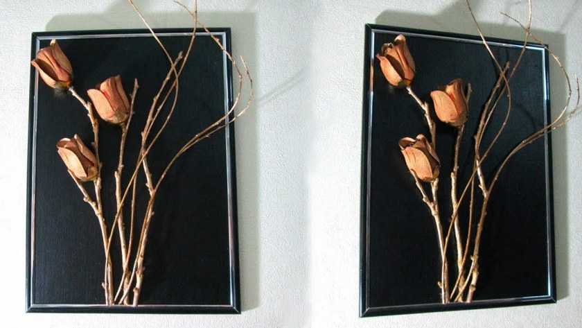 Панно из бумажных цветов на стену своими руками можно сделать в технике 3Д-аппликации. Проще всего подобрать постер с изображением бутонов. Тогда поделка будет выполняться на уже готовом фоне.