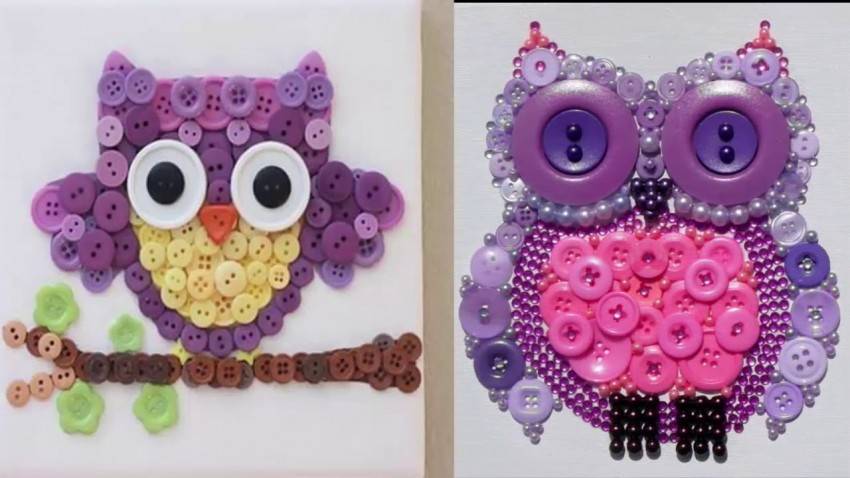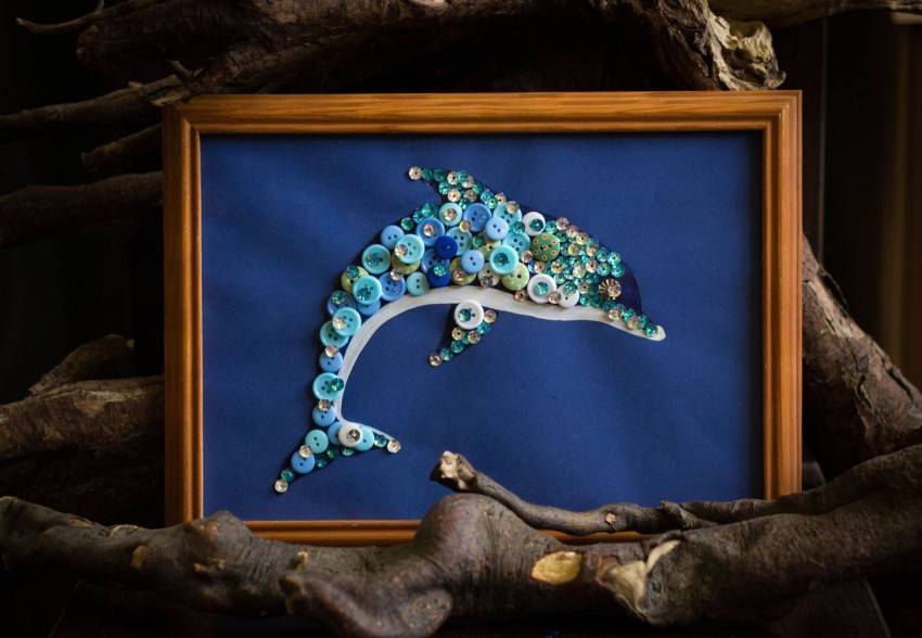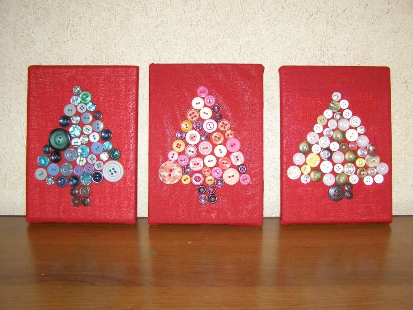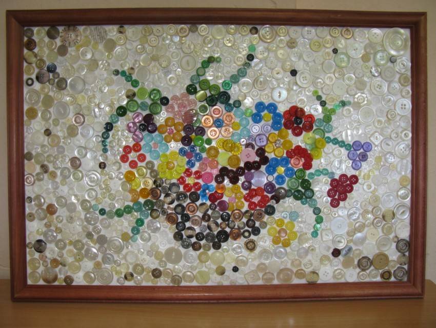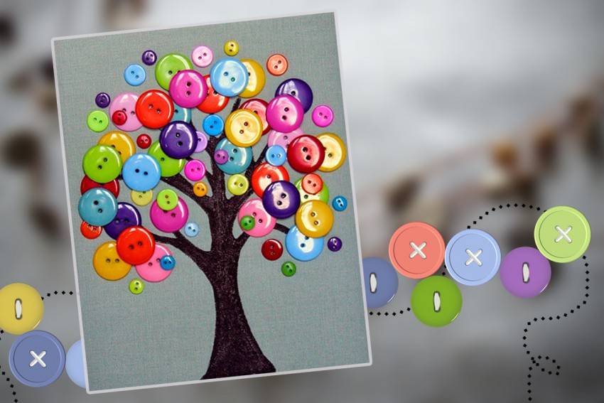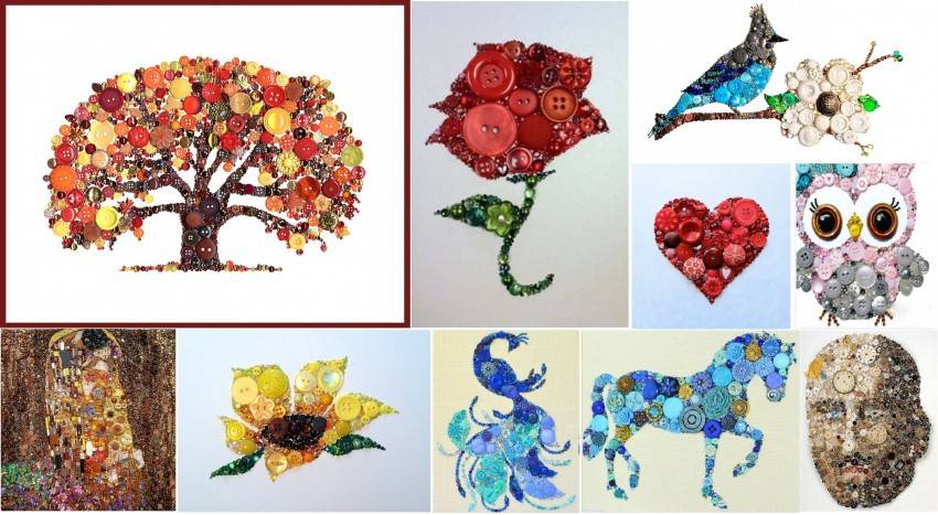 При помощи пуговиц на стене создаются самые необычные картины. Для этого на основу (фанеру, обтянутую полотном) наносится рисунок, который затем обклеивается пуговицами. Можно создать дерево, на основе нарисовав красками или приклеив бумажный ствол, а крону сделав из пуговиц.