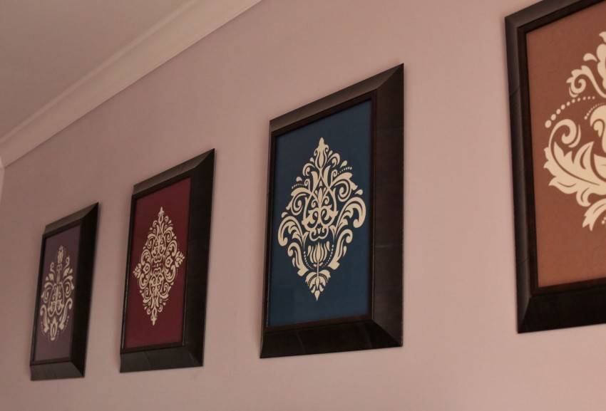 Уровнем вымеряется и очерчивается пространство для приклеивания обода. Сам багет подрезают на месте стыков под углом 45°. По проведенным линиям соединяют его со стеной. После этого излишки клейкой массы удаляют, раму окрашивают. Включают фантазию и склеивают шедевр из лоскутков, цельного куска или объединяют эти два способа вместе.