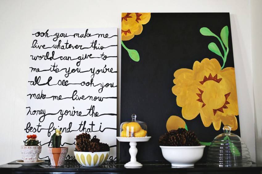 Для ровных однотонных стен, идеально подойдут большие картины с современным творчеством, крупные буквы, надписи и графичные постеры.