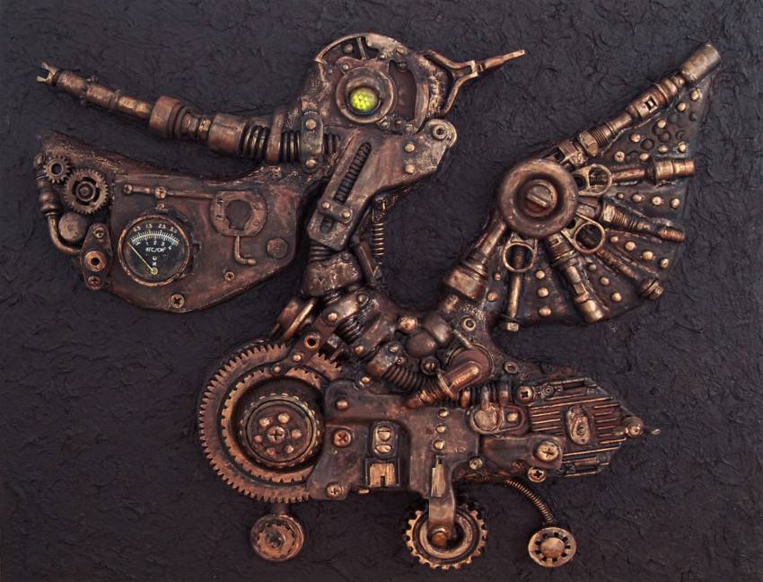 На панно своими руками для интерьера можно вообще клеить готовые изделия или вещи при условии, что они сами по себе легкие и миниатюрные. В частности, речь идет об игрушечных машинках, шестеренках, лампочках, болтах, нашивках и т.д.