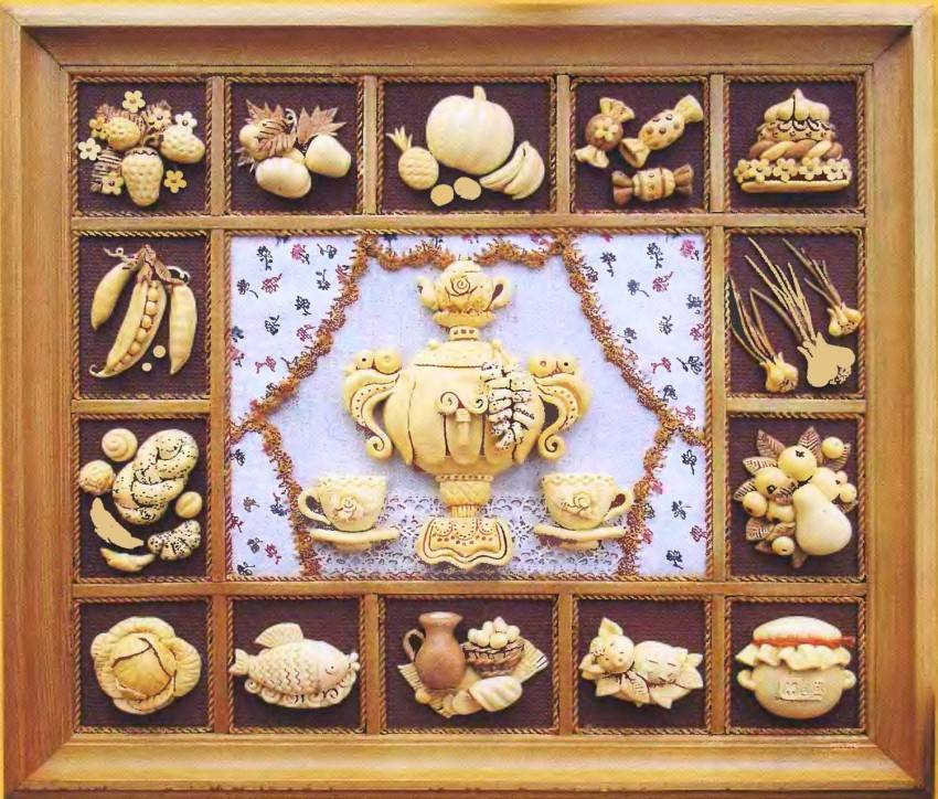 Также в кухне можно расположить панно средних размеров, изображающее чаепитие: вылепить из соленого теста самовар, чашки, баранки; после запекания фигур раскрасить их и создать из них композицию.