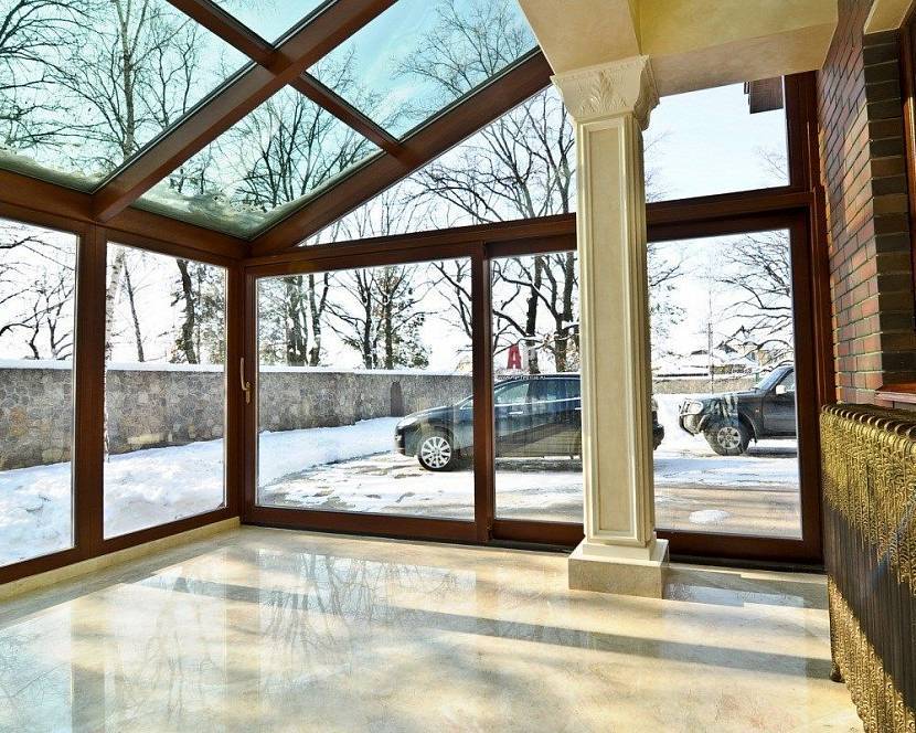 - Теплые окна предполагают использование таких материалов как пластик или дерево. Для каркаса обычно используют клееный брус таких пород как дуб, лиственница или сосна. Массив не используется из-за его склонности к деформациям. Несомненным преимуществом деревянных панорамных окон является то, что они обеспечивают постоянную вентиляцию в помещении даже в закрытом состоянии. Именно этот факт толкает многих на такую дорогостоящую покупку. Однако не стоит забывать и о повышенной требовательности деревянных изделий по уходу за ними. Пластиковый профиль используется наиболее часто. Этот материал прост в обработке и позволяет изготовить рамы любой конфигурации. При этом пластиковые рамы прочны и доступны по стоимости. Пластиковый профиль позволяет устанавливать 3-х и более камерные стеклопакеты. Это позволяет подобрать оптимальное соотношение цены/качества и желаемый уровень тепло- и шумоизоляции.
