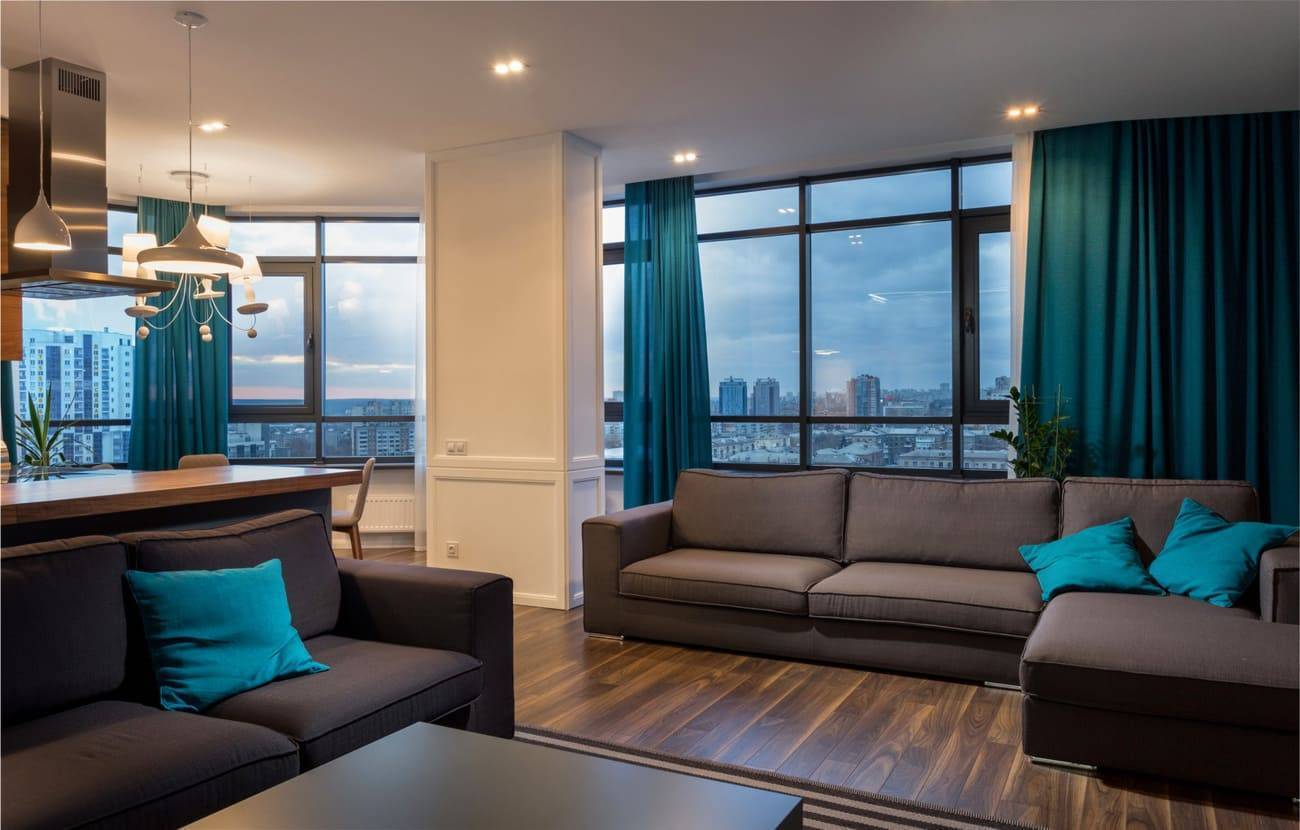 Часто встречаются гостиные, в которых имеется не одно, а два, три и даже четыре окна. Они могут быть расположены как рядом, так и на разных стенах. Реже встречается угловое размещение. В случае когда окна идут подряд, можно подобрать для оформления как одинаковые шторы, так и повторяющиеся через одну.