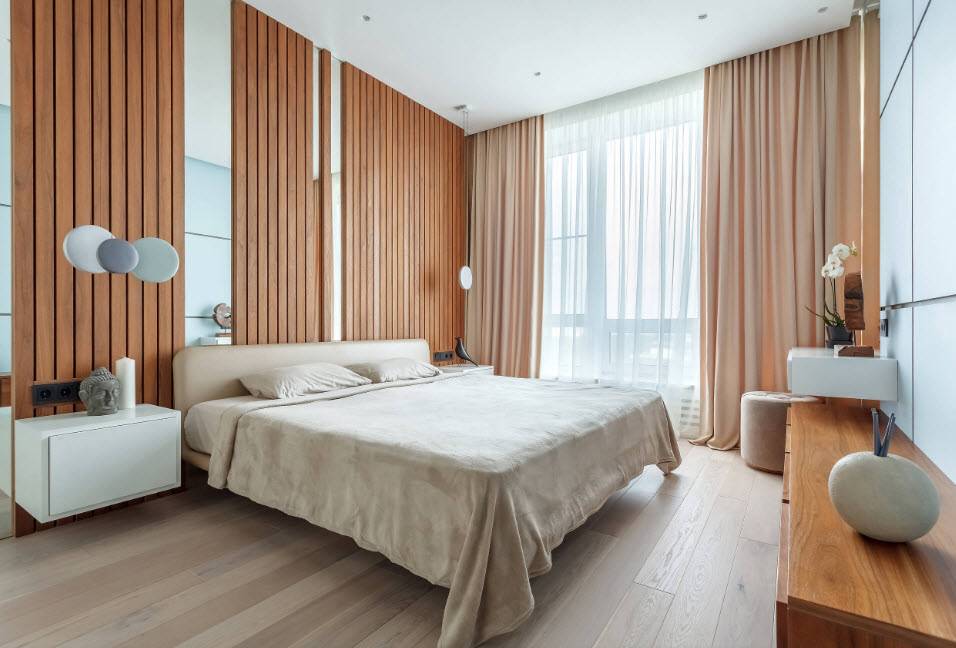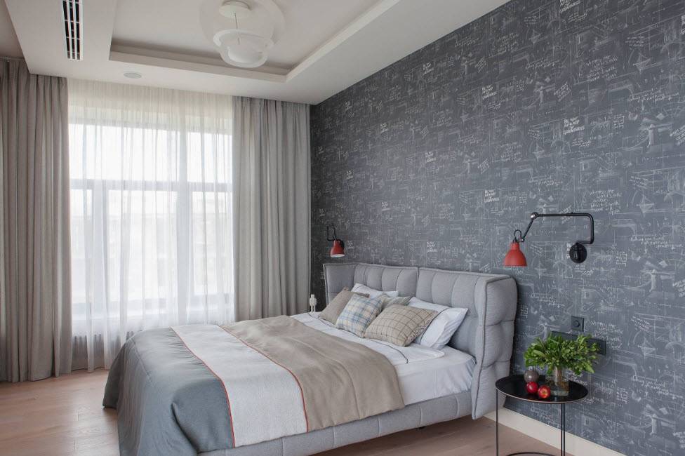 При отделке такой спальни лучше применять простые материалы. Подойдут обычные обои, краска. Главное – никаких сложных узоров – они могут нарушить световой баланс. Пол и потолок также не следует утяжелять замысловатым орнаментом.