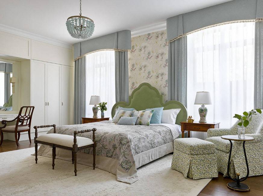 Окно в такой спальне считается важной частью интерьера, оно оформляется с особым вниманием. Важная роль в декорировании отдана текстилю: вычурным ламбрекенам, узорчатым карнизам, подхватам, кистям, бахроме и сложным композициям из разных видов материи