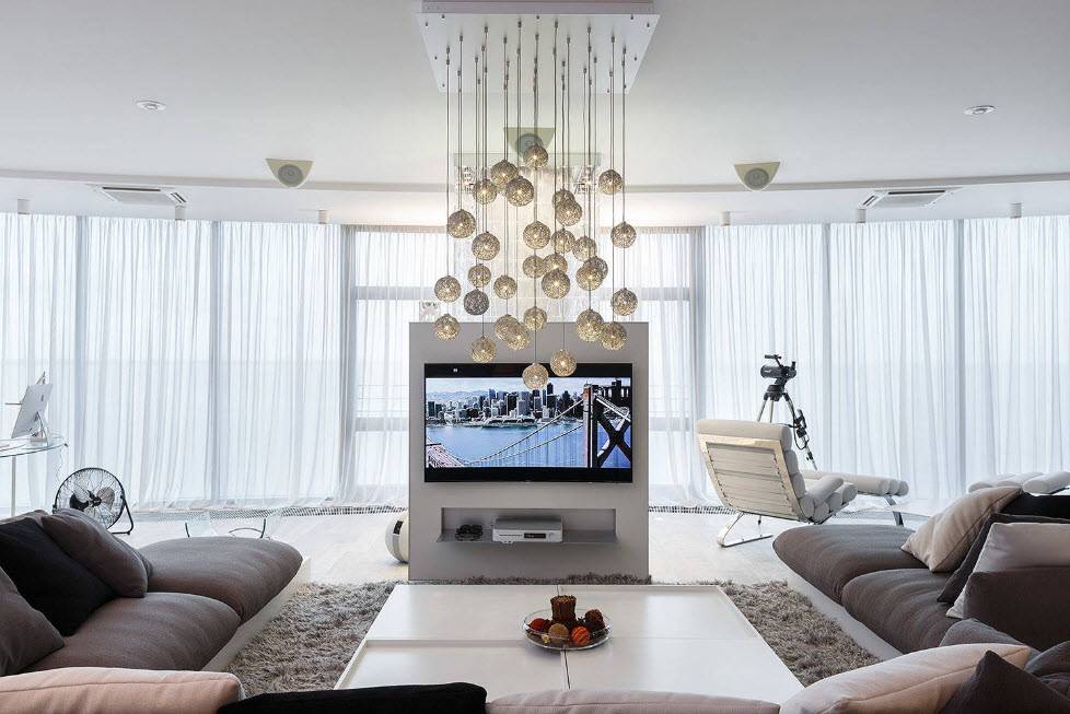 Диван по центру комнаты – решение не совсем привычное для нашей страны, но весьма интересное и функциональное