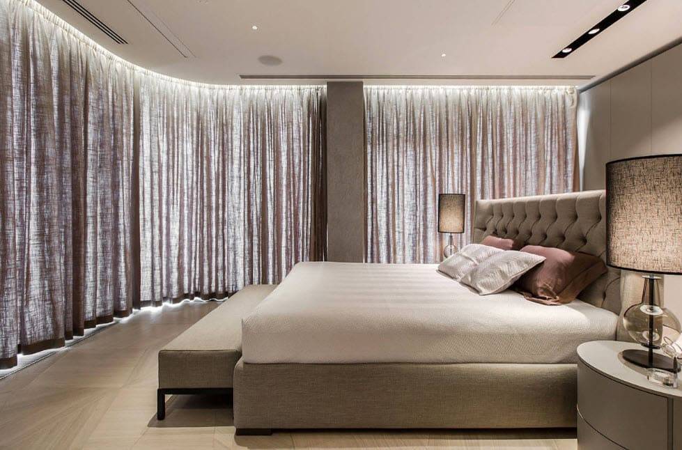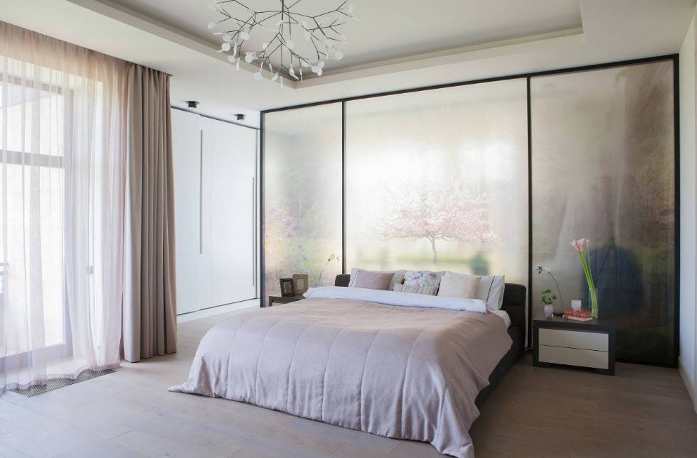 Спальни с панорамными окнами дают возможность разыграться дизайнерской фантазии. Уместны варианты оформления как со светлыми тонами, так и с природными, например, коричневыми оттенками. Многое зависит в данном случае от вида из окна, поскольку спальня с панорамным окном в значительной мере как бы продолжает и дополняет пейзажную композицию.