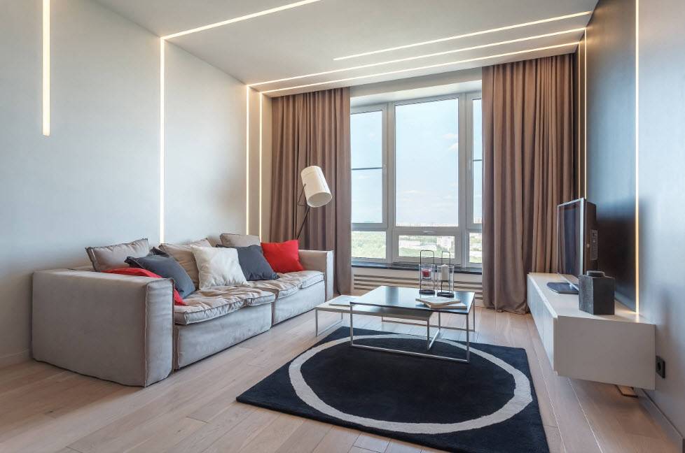 Когда зал небольшой площади, лучше выбрать компактные предметы мебели, трансформеры, передвижные кресла и столики. В противном случае зал будет выглядеть перегруженным, даже захламленным.