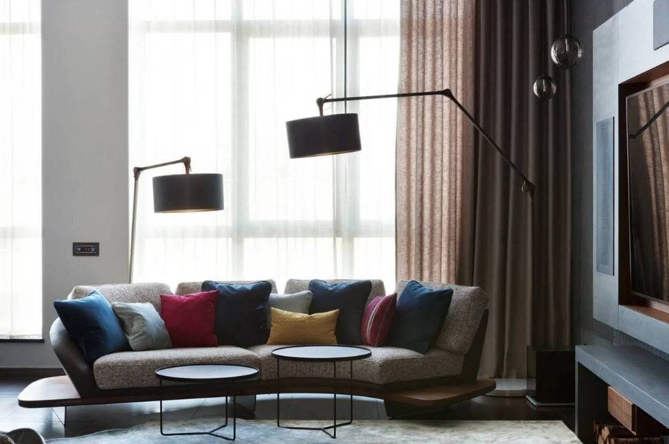 Все проемы должны быть оформлены одинаково, если интерьер не предполагает асимметрию. Различие может быть только в том случае, когда гостиная выполнена в стиле модерн. Необходимо соблюдать единство стиля. Проявляется оно в том, что шторы должны быть выполнены в одной расцветке и текстуре.