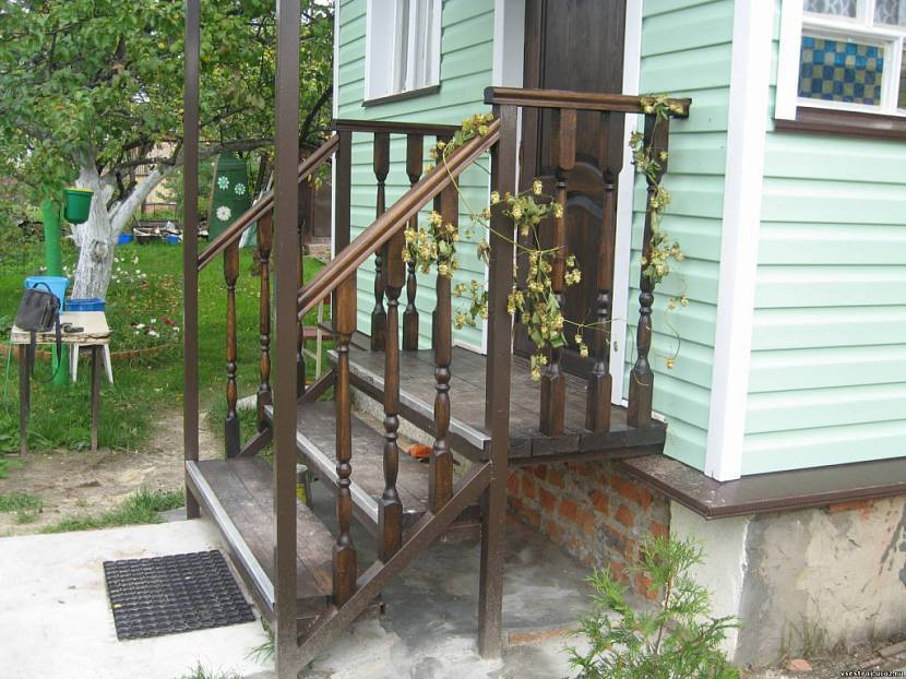 Иногда можно увидеть в конструкциях крыльца такой элемент, как металл. Из него изготавливают лестницы и их детали. Обычно подобные решения характерны для небольших домов