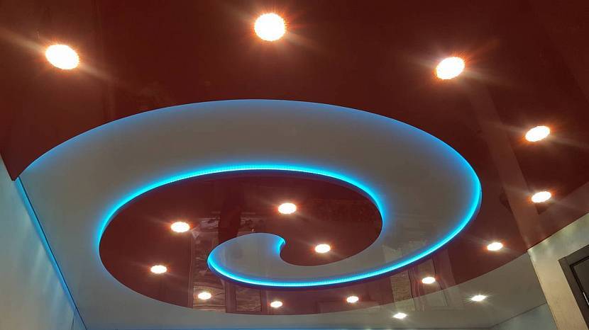 В последнее время на строительном рынке можно встретить огромный выбор освещающих приборов, которые используются для установки подсветки. Обычно мастера для монтажных работ предпочитают приобретать люстры и накладные лампы, но по своим характеристикам им ничем не уступают и галогенные лампочки. Красиво в интерьере смотрится комбинация с традиционными светильниками и светодиодной лентой.
