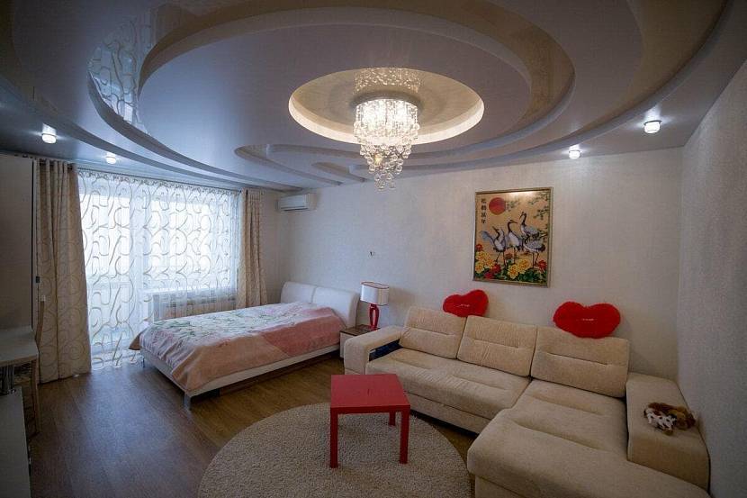 Подиум на потолке в гостиной-спальнеИсточник format-potolok.ru/