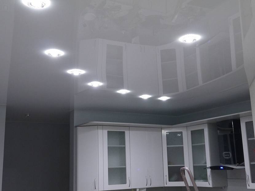 Натяжной потолок на кухне с необычным расположением точечных светильниковИсточник natyazhnoy-potolok.su