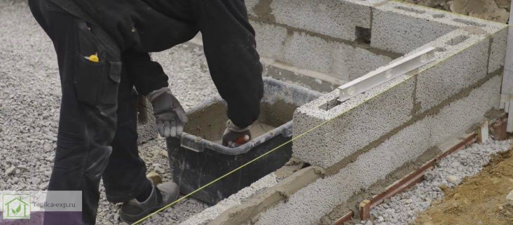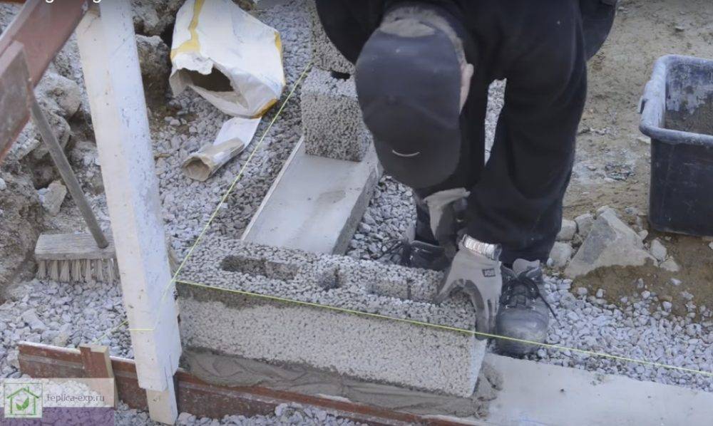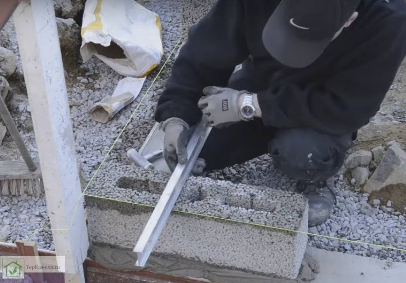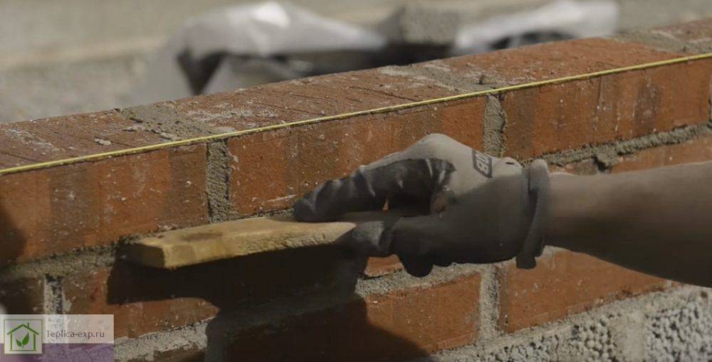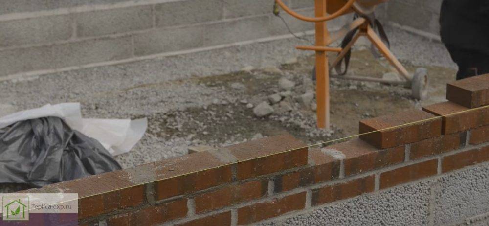 Шаг 3. Начните укладку. Цоколь сооружайте методом «в половину кирпича». Контролируйте положение кирпичей с помощью уровня и натянутых нитей.