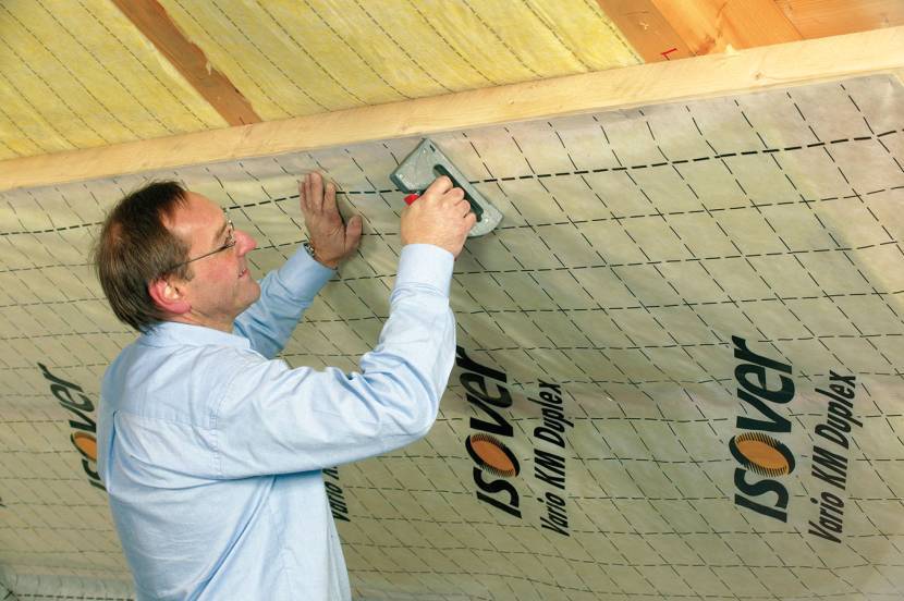 Монтировать пароизоляционный барьер на потолок необходимо с небольшим напуском на стены по периметру, при этом особое внимание следует уделить углам. Стыки лучше располагать на лагах и проклеивать с двух сторон скотчем на армированной основе