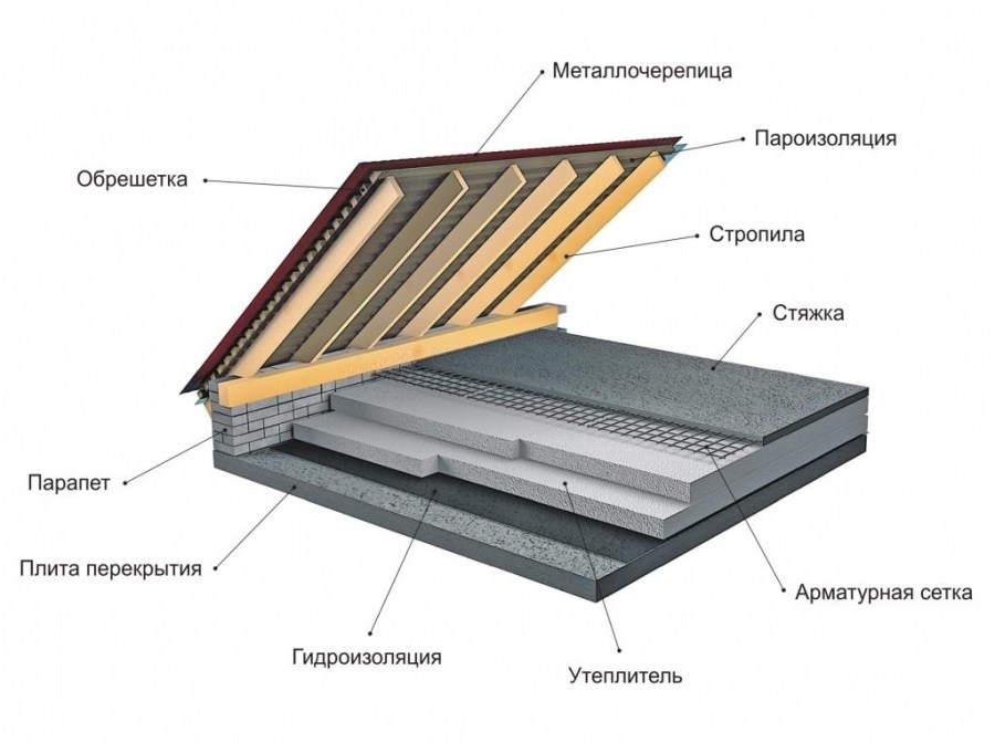 Конструкция пирога кровли начиная внутри предполагает следующую очередность: