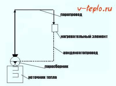 Радиаторные батареи и трубопроводы пара характеризуются повышенной температурой нагрева. В некоторых случаях температура может превышать 1000 градусов по Цельсию. Система трубопровода включает в себя вертикальные и горизонтальные трубы. Обычно используется два вида разводки — верхняя и нижняя. Выбор осуществляется в зависимости от особенностей помещения.