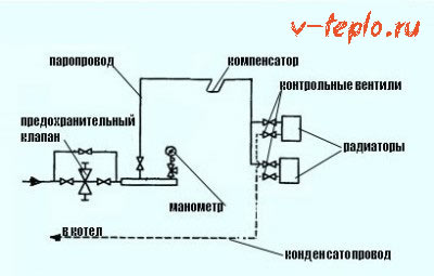 Пар поступает в отопительный прибор из котла и отдает тепло парообразования через стенку воздуху в помещении. Чтобы отводить воздух в самой низкой точке паровой системы, используют воздуховыпускные петли с кранами. От давления систему защищают предохранительными петлями, которые состоят из гидравлических затворов и паровыбрасывателей.