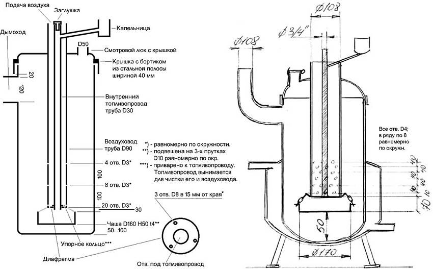 Некоторые используют схемы, позволяющие самостоятельно сделать конструкцию, работающую на отработанном масле. Такие модели печей устанавливают, когда не хватает угля с дровами.