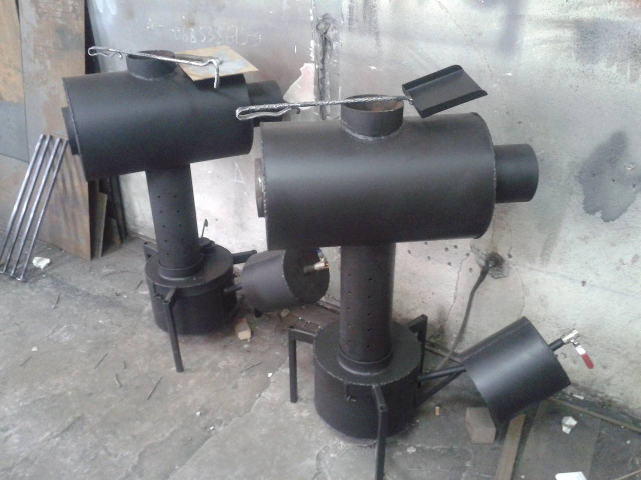 Бак сваривается из прочных железных листов толщиной 10 миллиметров. Затем в одной из стенок сваренной конструкции делают отверстие, через которое подают топливо. После этого к баку присоединяют отсек для дожигания, который также сделан из листов металла. К верхней части конструкции приваривают дымоходную трубу.