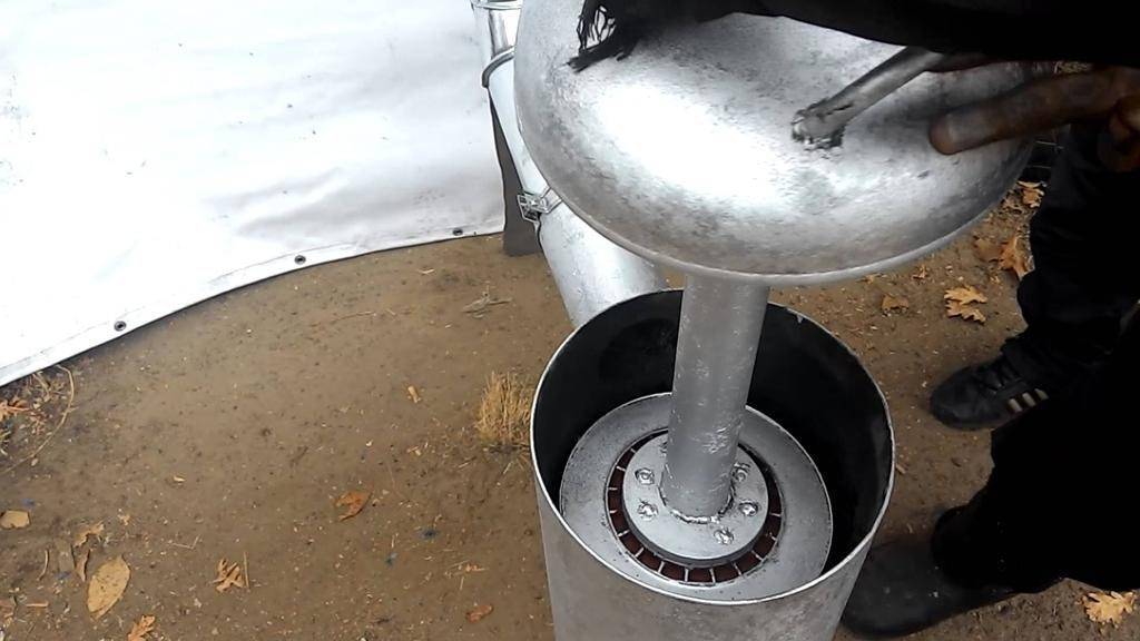 - Вырезаем ещё круг из стали диаметром чуть менее бочки или трубы, а в нём ещё один для маленькой трубы примерно на 12 см. Отрезок трубы приваривается к стальному кругу.