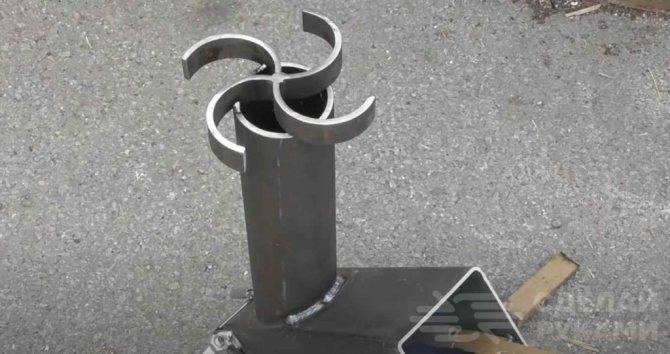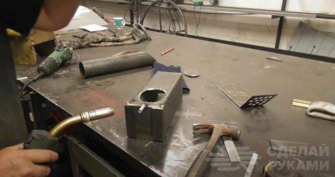 На последнем этапе останется только приварить к вертикальной части ракетной печи площадку для посуды, изготовленную из стальной полосы.