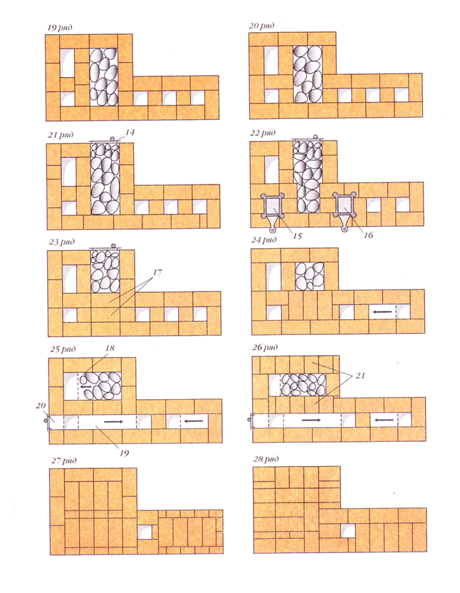 с 19-го по 21-й ряд — завершение кладки лежанки;