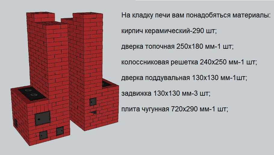 Классическая русская печь, описанная выше, в зависимости от размера требует примерно такого количества материалов: