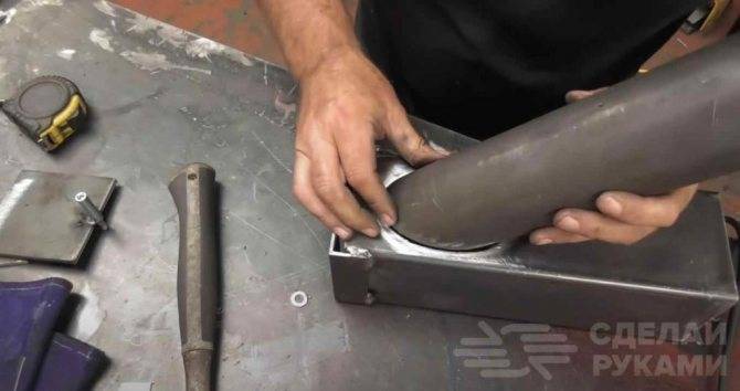 Далее отрезаем кусок круглой трубы, обрезаем один край под углом, и затем привариваем его к профильной трубе.