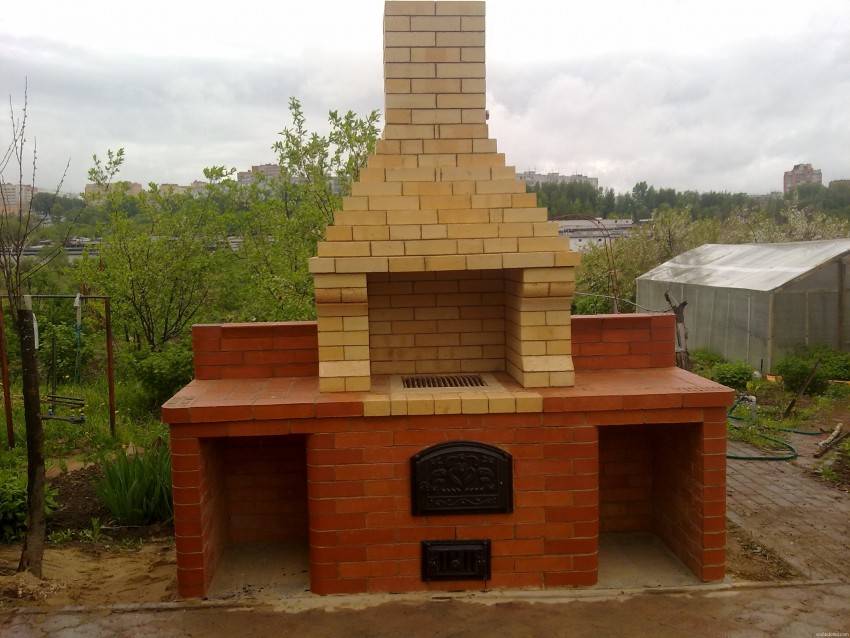 Примитивная конструкция стационарного уличного мангала предполагает открытый с одной стороны кирпичный короб с суживающимся кверху дымоходом. Такой вариант ближе не к русской печи, а к английскому камину.
